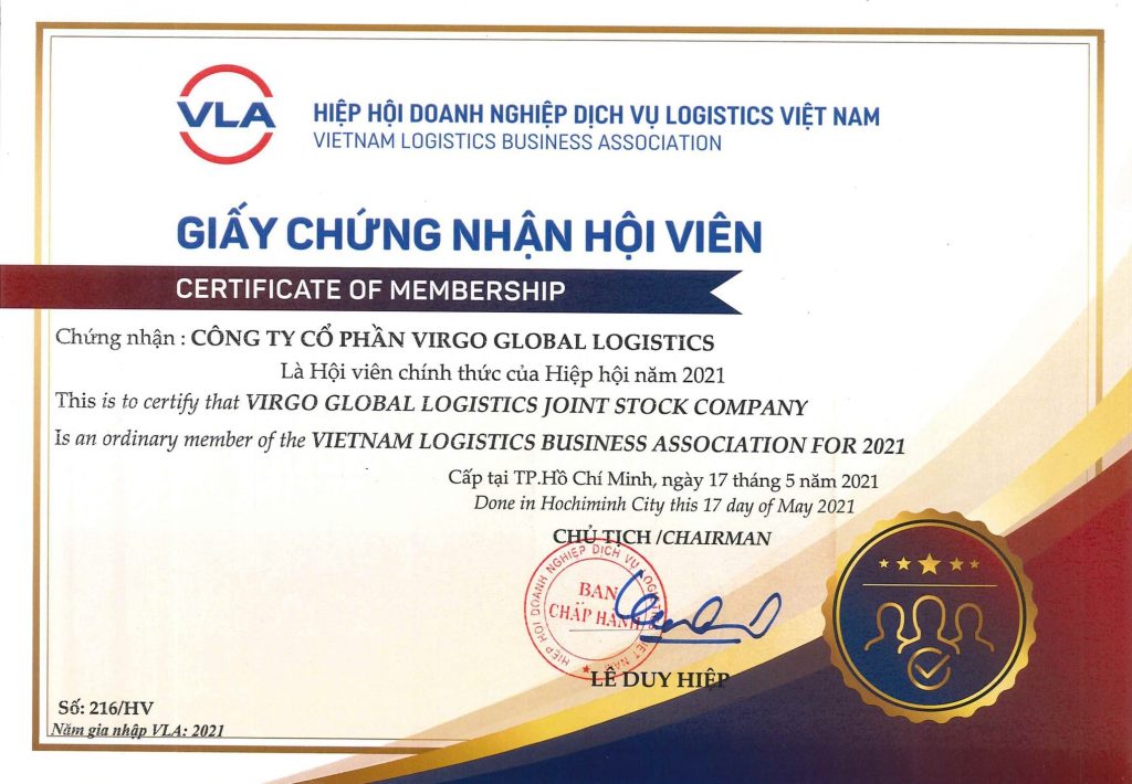 Ngày 17/05/2021, Hiệp hội doanh nghiệp dịch vụ logistics Việt Nam (VLA) đã trao giấy chứng nhận thành viên cho Công ty cổ phần Virgo Global Logistics. Tại buổi lễ kết nạp, Ông Lê Duy Hiệp – Chủ tịch VLA hoan nghênh việc Virgo trở thành thành viên chính thức của hiệp hội VLA. Với việc trở thành thành viên chính thức của hiệp hội VLA, Virgo mong muốn sẽ đóng góp nhiều hơn nữa vào sự phát triển và bền vững của ngành logistics Việt Nam.